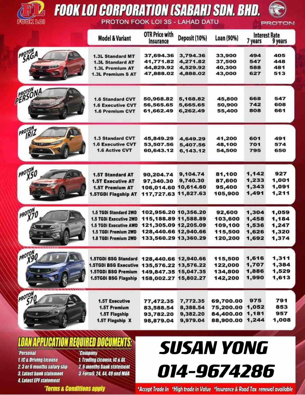 Hai! Nama saya Susan Yong, Sales Advisor Proton Sabah yang sah. Berpengalaman lebih 10 Tahun dalam bidang jualan kereta di Malaysia.