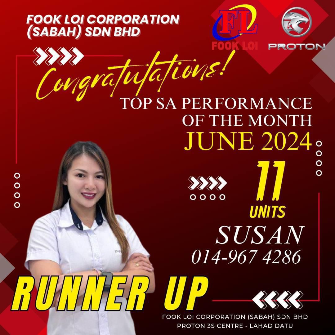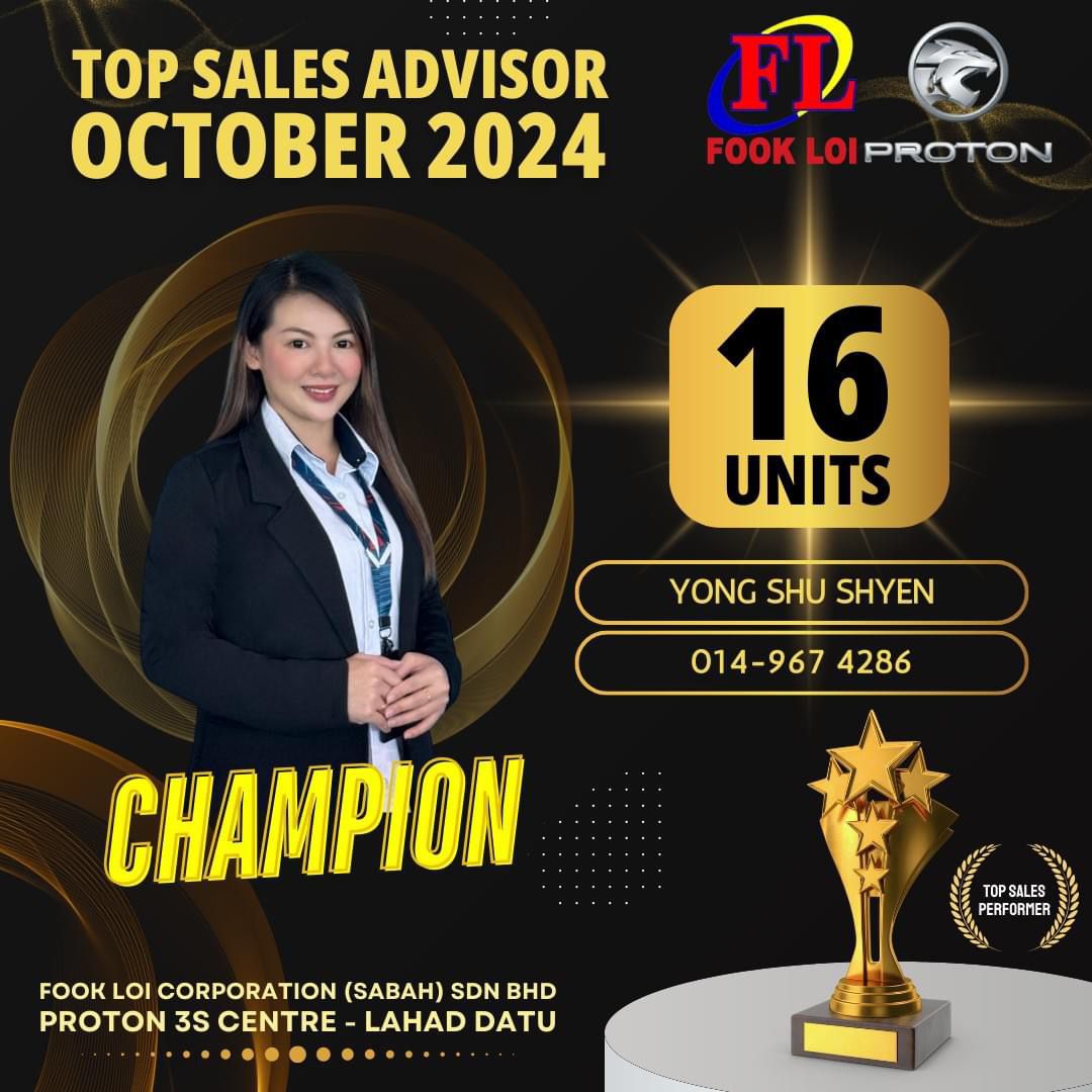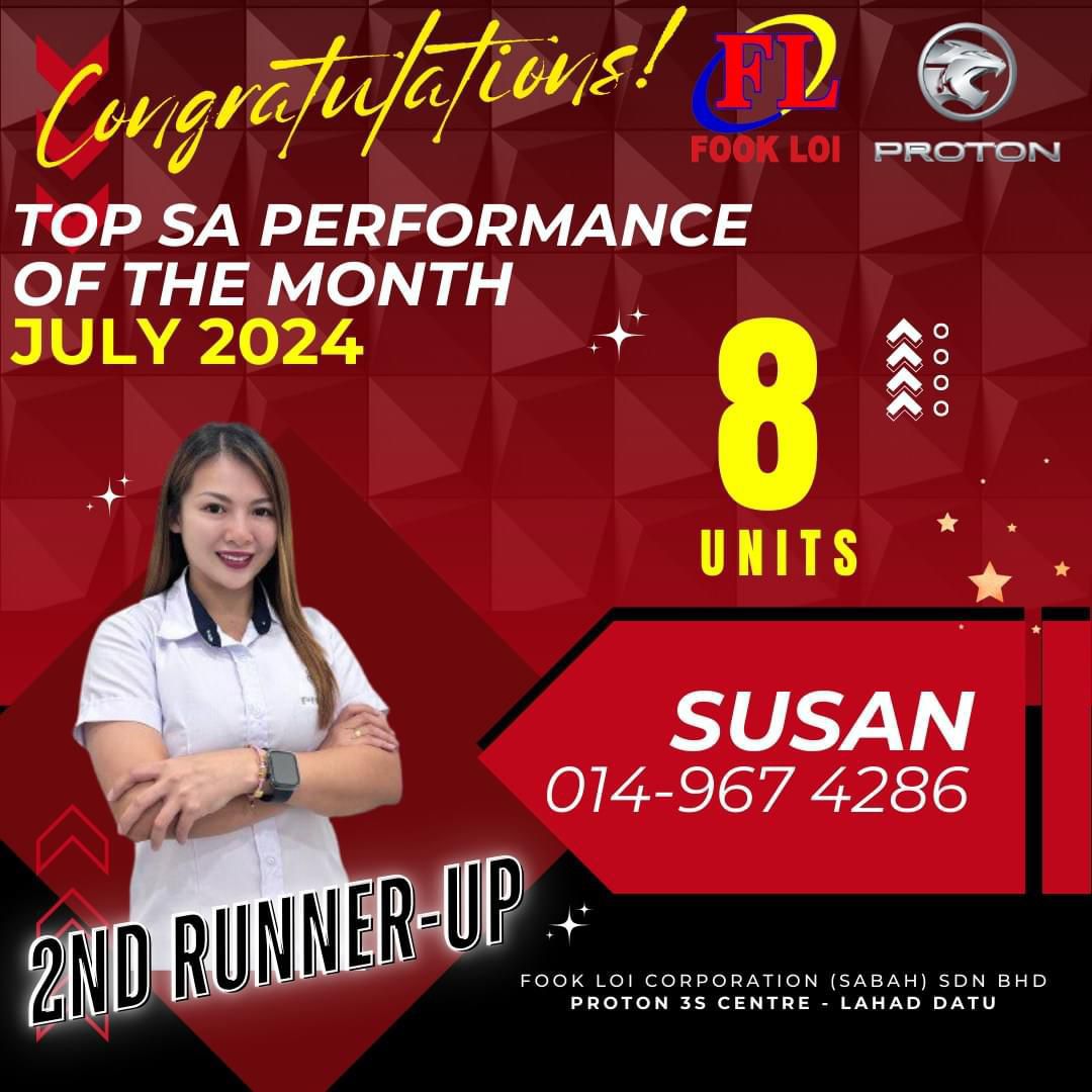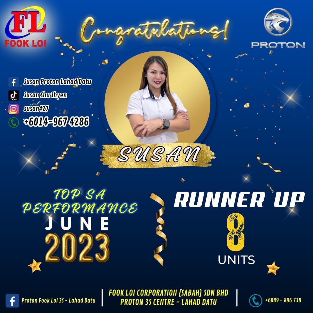 Hai! Nama saya Susan Yong, Sales Advisor Proton Sabah yang sah. Berpengalaman lebih 10 Tahun dalam bidang jualan kereta di Malaysia.