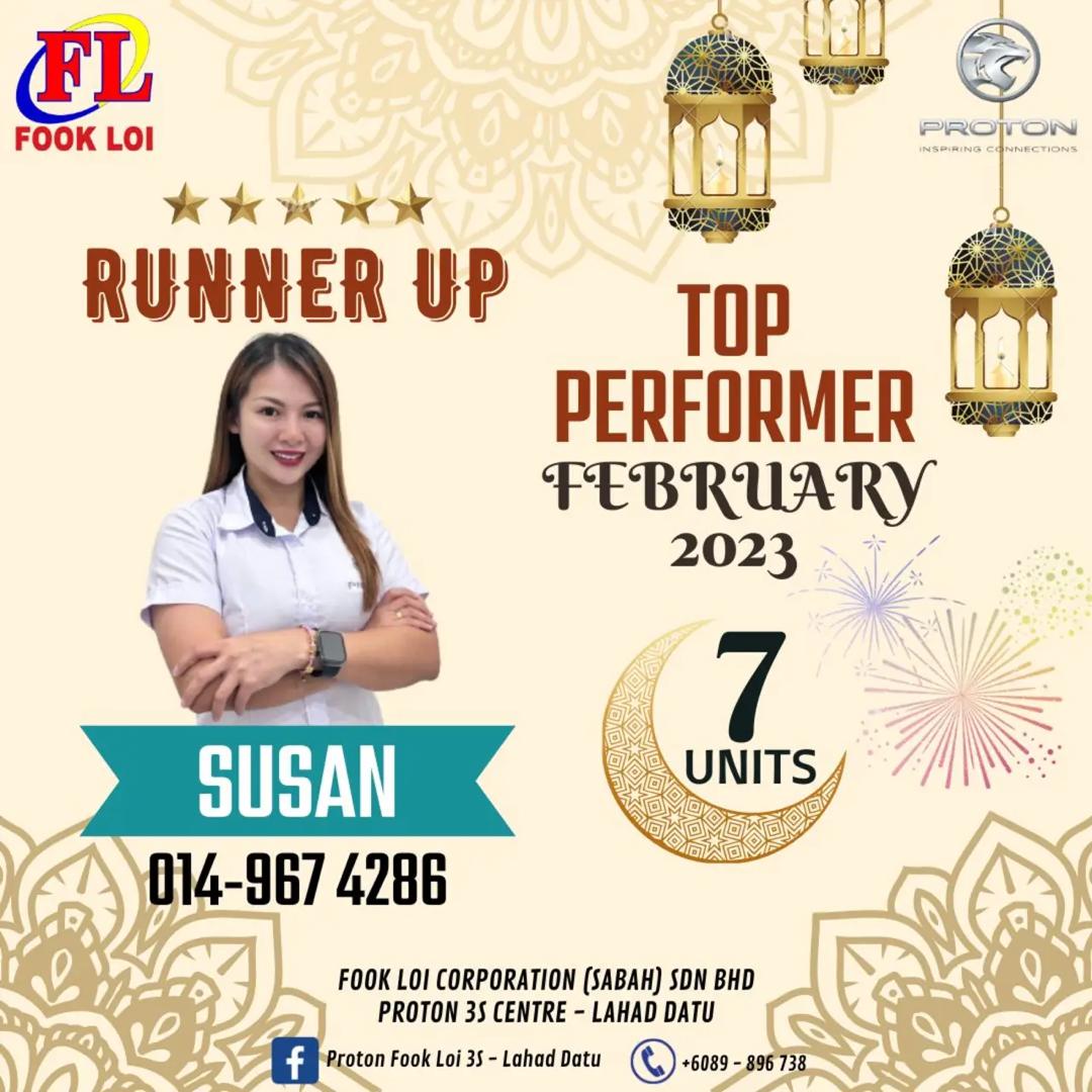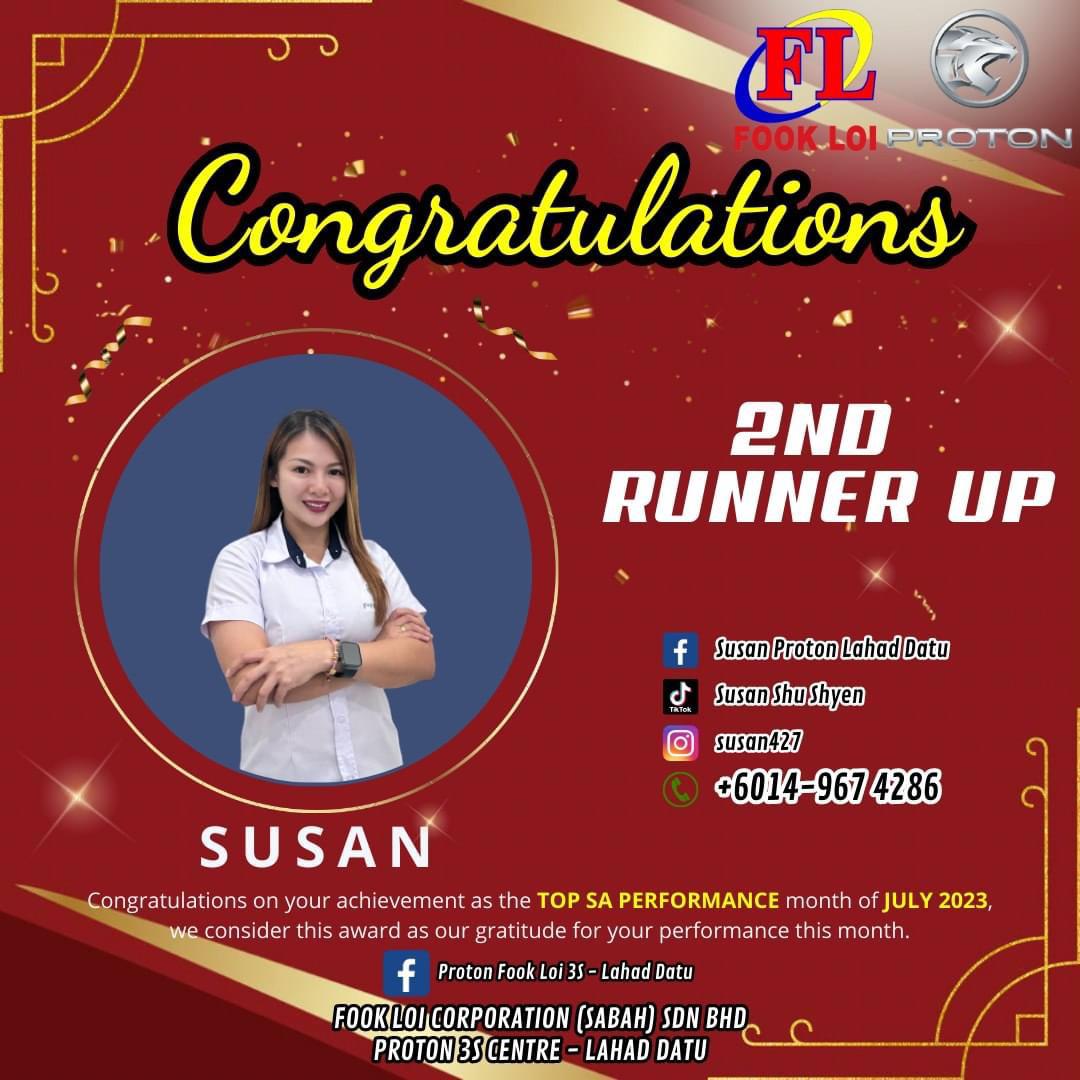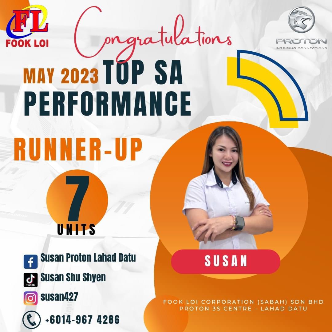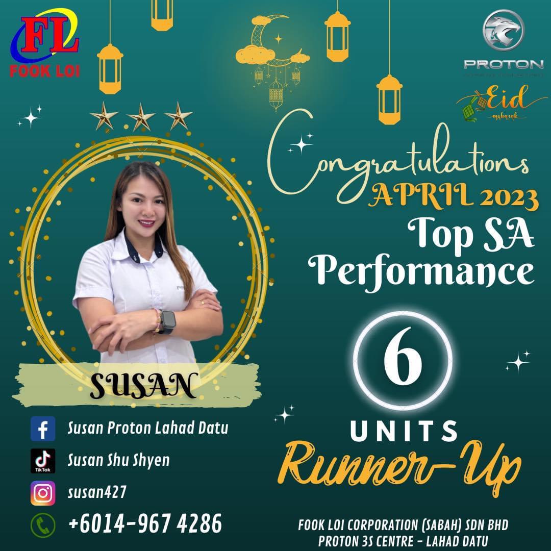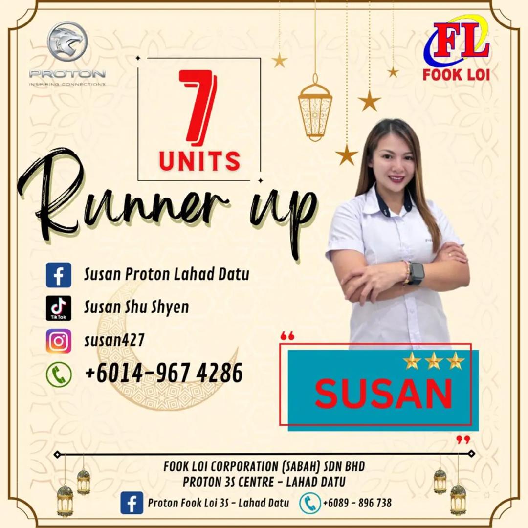 Hai! Nama saya Susan Yong, Sales Advisor Proton Sabah yang sah. Berpengalaman lebih 10 Tahun dalam bidang jualan kereta di Malaysia.